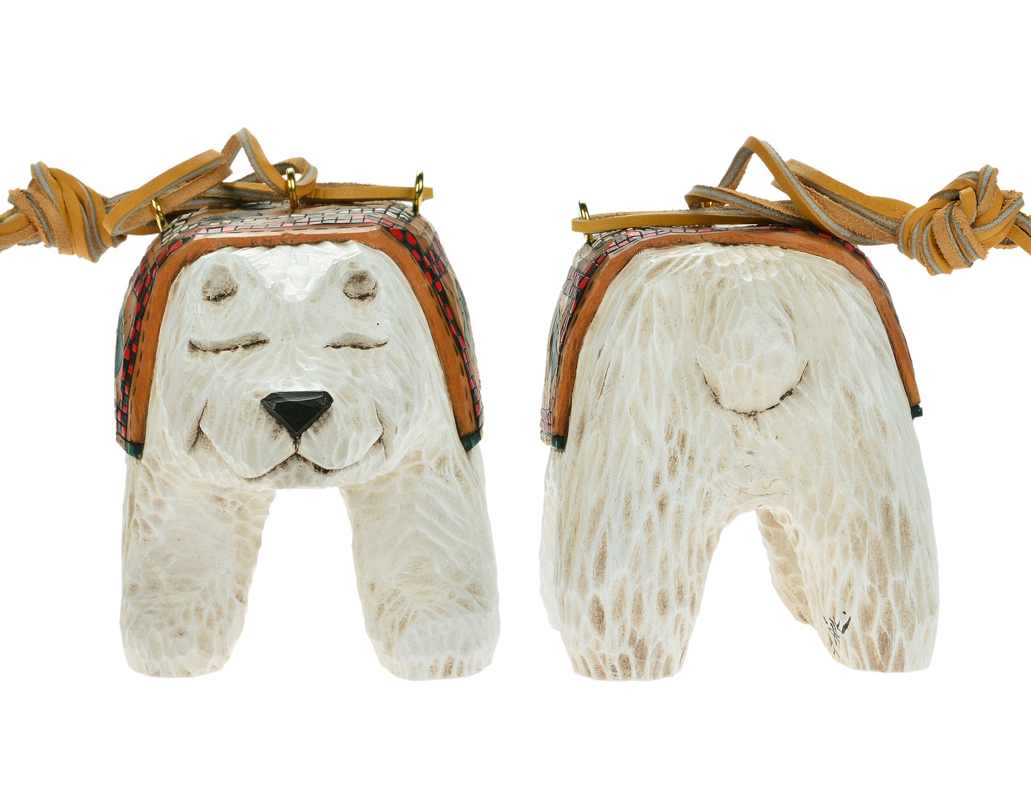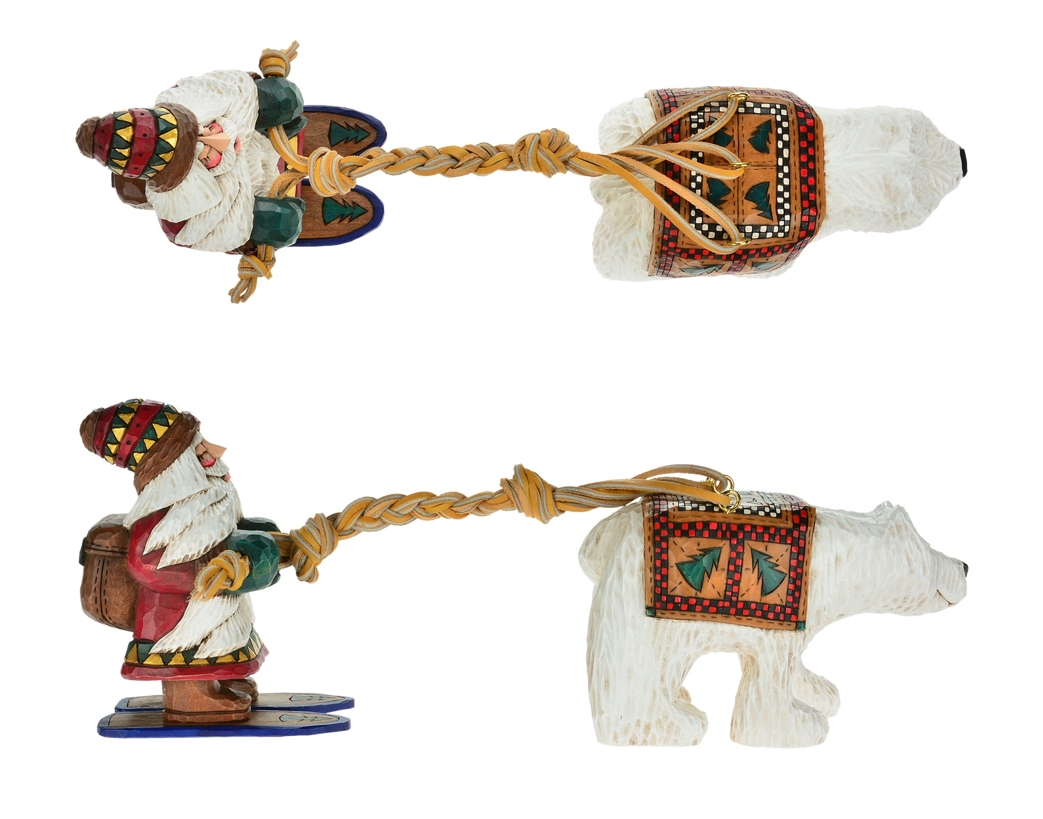 Santa's traveling through the arctic. This showstopper features incredible detail in the quilt of the polar bear and the robes of Santa. Tethered together but a leather strap.