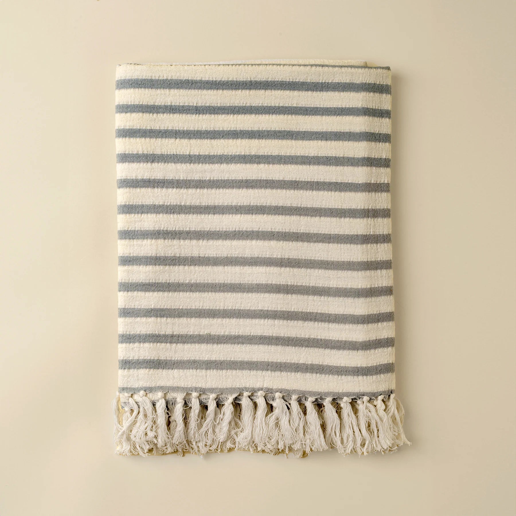 Lightweight and effortlessly stylish, the Castaway Cotton Throw is your new go-to for coastal-inspired comfort. Woven from soft, natural cotton, this summer-weight throw blanket features cream and blue stripes, a hand-knotted fringe, and a breezy feel that suits any season. Whether draped over a chair, layered on a bed, or packed in your picnic basket, it’s the kind of piece that goes where you go.