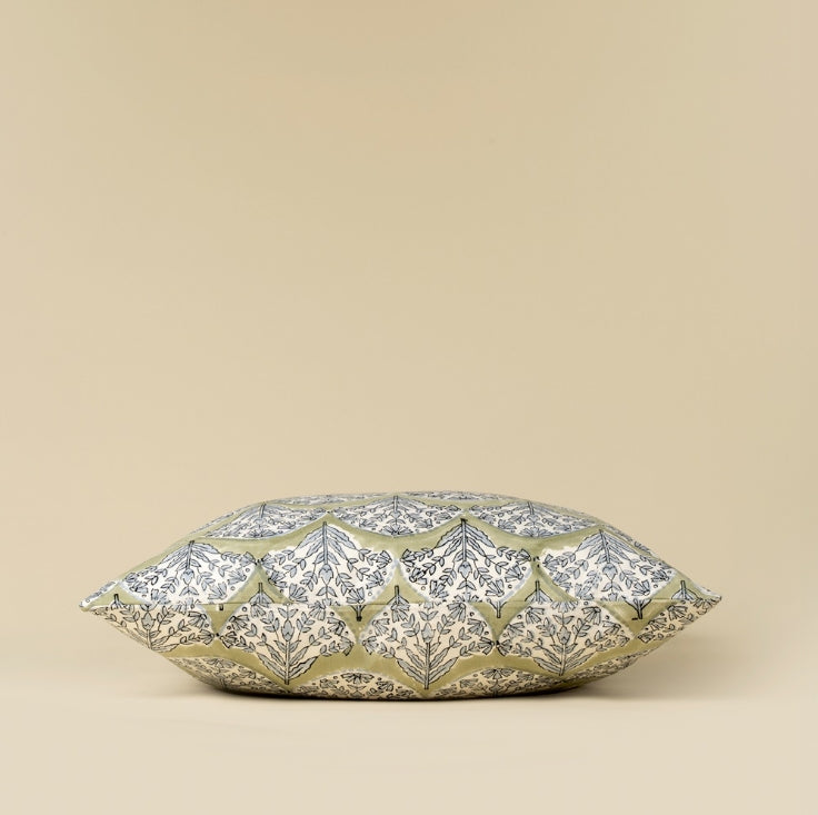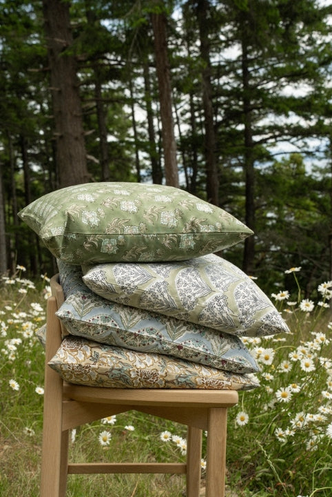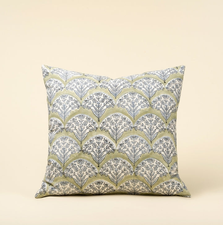 Brighten your home with the Sakura Block Print Pillow, a decorative pillow designed to delight. Hand block printed by skilled artisans in India, this modern decorative pillow features a fan-like pattern of floral sprays in pastel blue on a soft green base. Made from 100% organic cotton, it's the perfect way to bring artisanal detail and seasonal colour into your collection of accessory pillows.