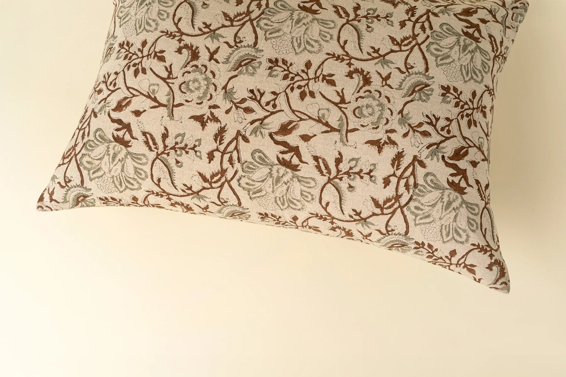 Inspired by nature and made with intention, the Sarika Block Print Pillow brings a calming, handcrafted presence to your home. Featuring a botanical pattern in sage green and rich brown, each pillow is hand block printed by artisans in India using ethically sourced materials. The cotton-linen blend offers natural texture, while the traditional printing methods ensure every piece is one of a kind.
