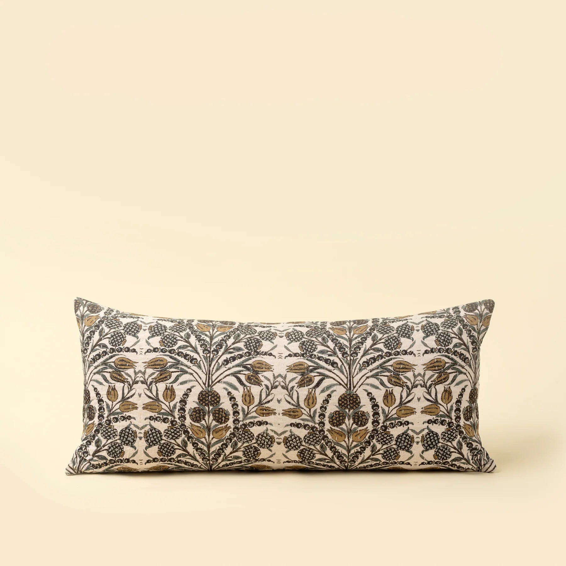 Celebrate artisan tradition with the Tropicana Kantha Pillow, a vibrant accent pillow crafted with care and cultural richness. Digitally printed on flecked cotton, this decorative toss pillow showcases a lush botanical motif in rich gold, charcoal, and teal tones. Hand kantha-stitched by women artisans working from home as part of a cottage industry, each pillow carries the mark of thoughtful, slow-made design. The subtle manual stitch adds textural charm, while the balanced colour palette lends itself beautifully to eclectic or grounded decor styles.