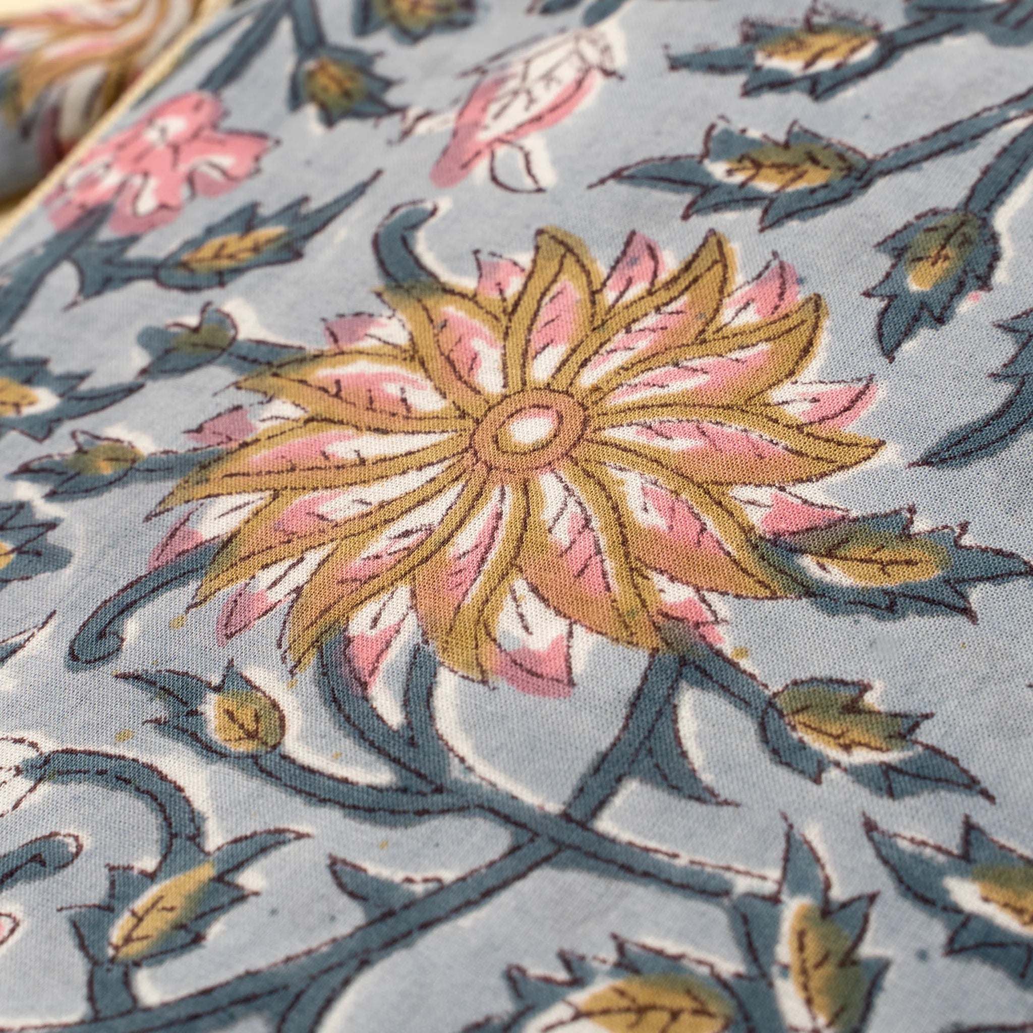 Stay organized in style with the Block Print Pouch in Blue. Hand block printed using traditional crafting methods, this vibrant clutch purse features a garden-inspired pattern in soft pink, marigold, and leafy hues against a dusky blue cotton base. Crafted from sustainable materials, it includes a smooth YKK zipper, a matching fabric pull, and a solid cotton lining for added durability. Whether you're organizing essentials inside your tote, stashing cosmetics, or heading out with just the basics, this pouch adds a bold yet refined statement to your daily routine.