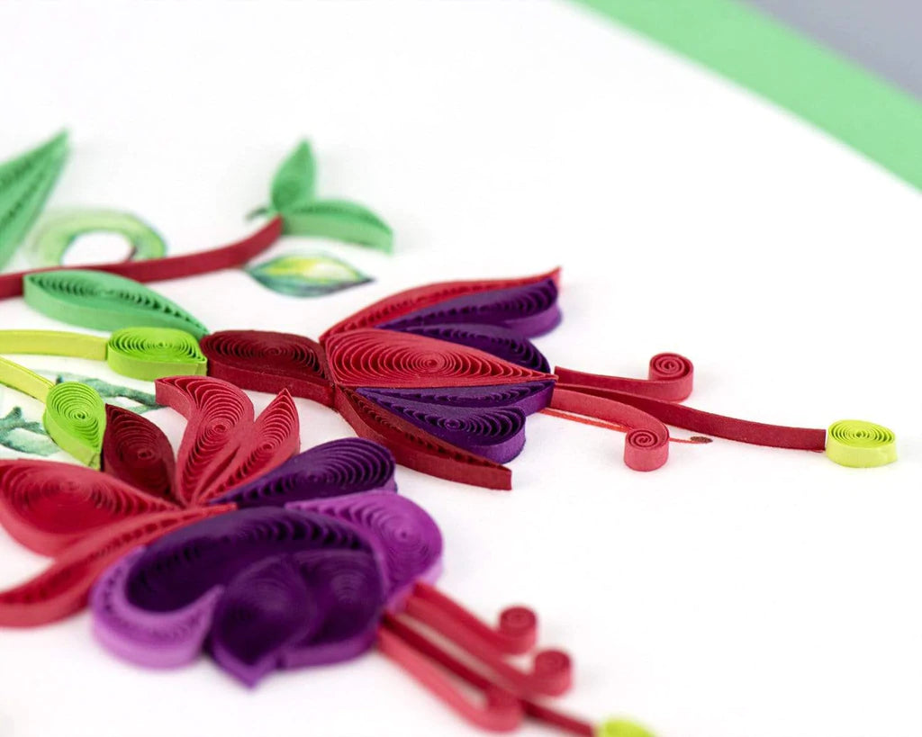 Send this beautiful Quilled Fuchsia Greeting Card to your friend or loved one to make their day brighter! This handcrafted design shows three purple and red fuchsia flower bulbs on a green leafy stem.