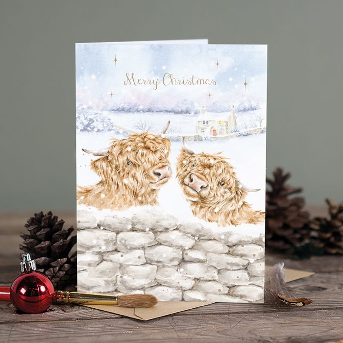 Perfect for the festive season, this design features Highland cows in a snowy field. The card is 6.77 x 4.84 inches and is printed on high quality, textured board. It is supplied wrapped with a recycled kraft envelope. The greeting inside reads 'With love this Holiday season.'