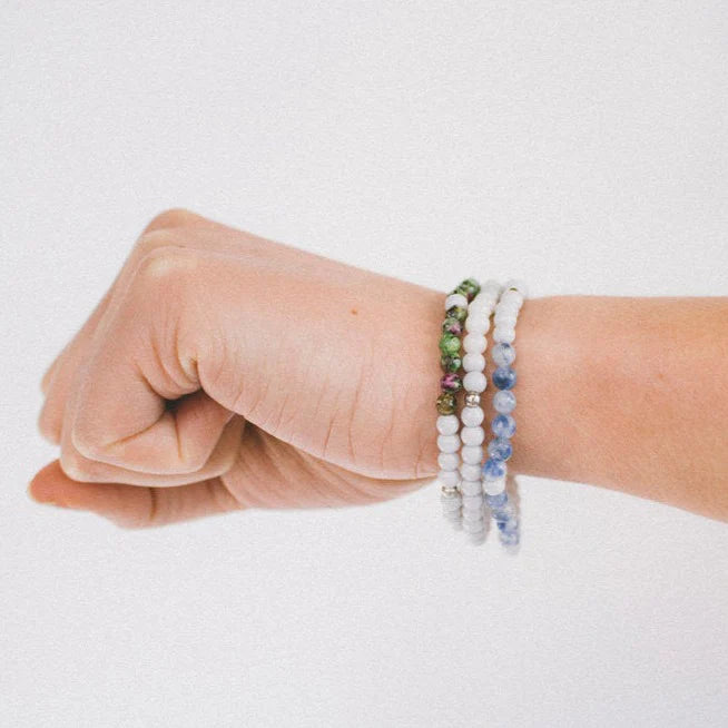 - Made with semi-precious stones, hematite, glass beads, and elastic