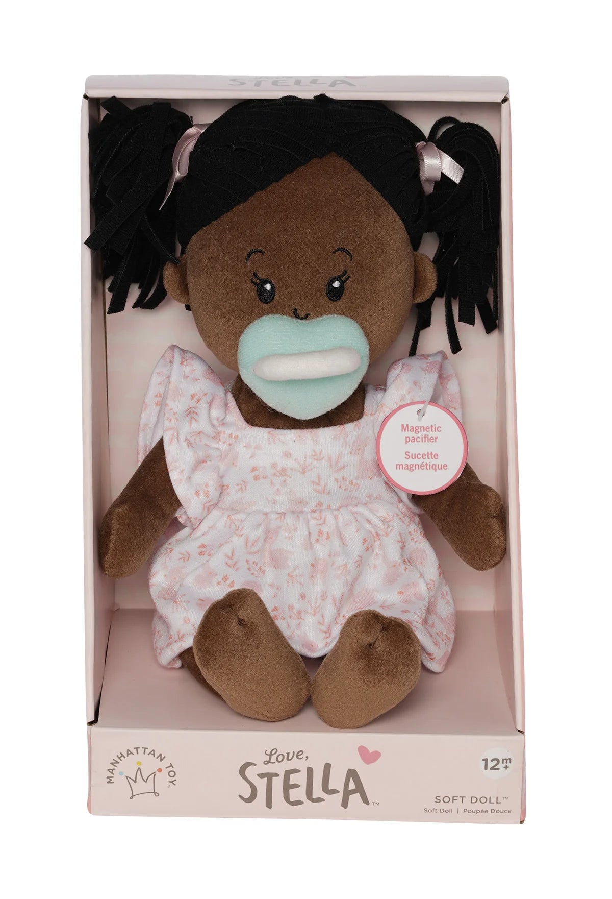 The Love, Stella dolls are the perfect size for holding, hugging, and nurturing role play to foster social and emotional development. Dolls are 100% soft with embroidered features, fabric hair, plump tummies, cute little belly buttons, and a signature magnetic pacifier design. The doll body has a weighted bottom and sits unassisted - perfect for playtime! Clothes are removable and feature hook-and-loop closures for supporting elementary dressing skills.
