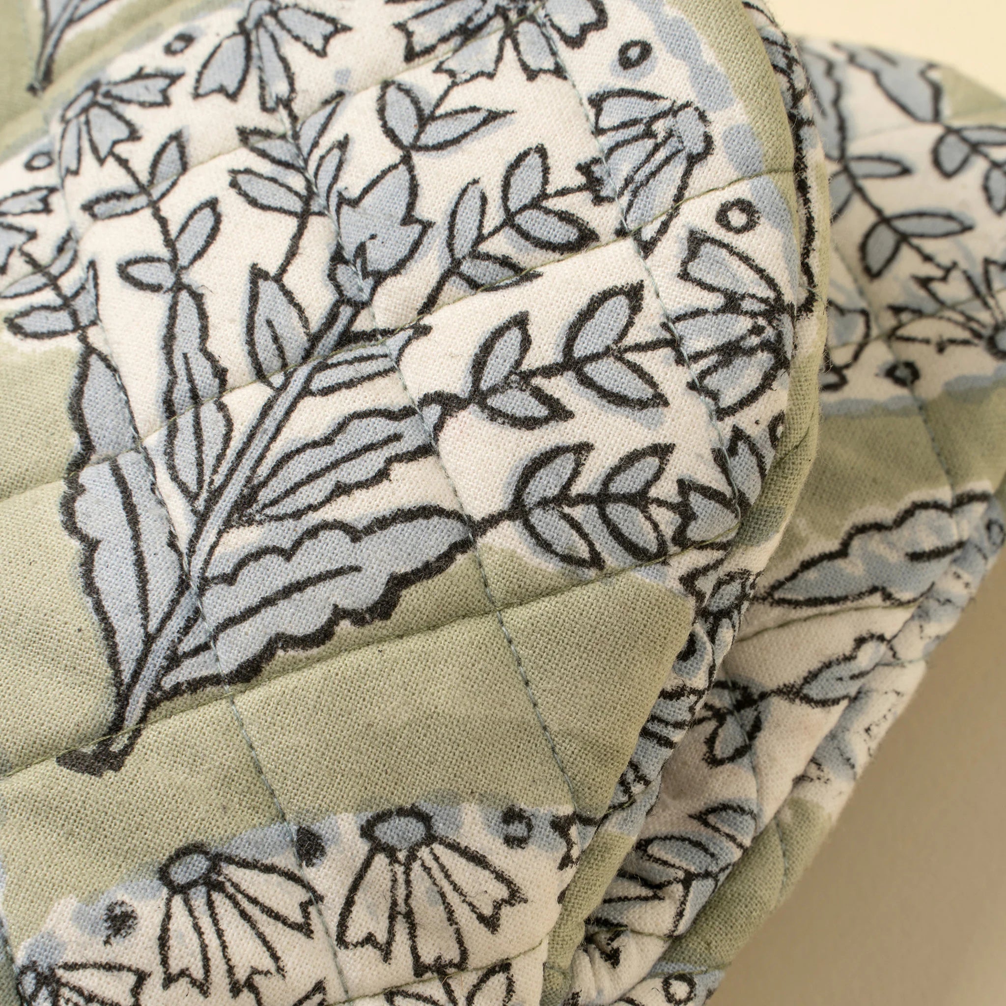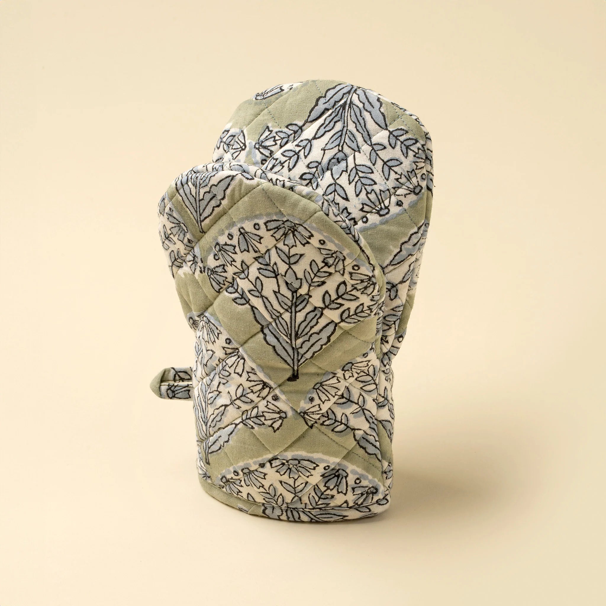 Add charm and practicality to your kitchen with the Sakura Block Print Oven Mitt. Made in India from 100% cotton, this artisan-crafted oven glove features a soft green base adorned with a fan-like pattern of floral sprays in muted blue, inspired by our traditional hand block printed designs. Its quilted texture, timeless silhouette, and easy-to-hang loop blend style and everyday functionality with ease.