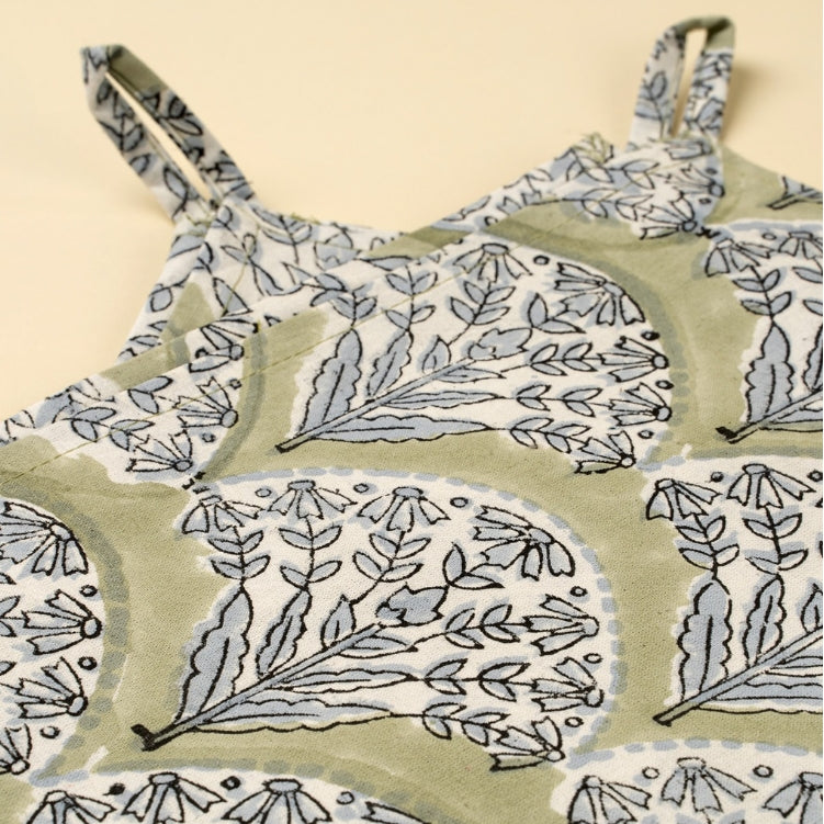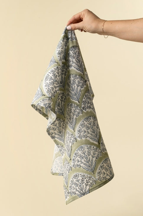 Add artistry and functionality to your kitchen with the Sakura Block Print Tea Towels in Green. Made in India from soft 100% cotton, this set of two features a fan-like pattern of floral sprays in muted blue on a soft green base, block printed by hand using traditional techniques. These towels are absorbent, lightweight, and easy to display and is perfect for drying dishes, lining bread baskets, or adding an artisanal accent to open shelving.