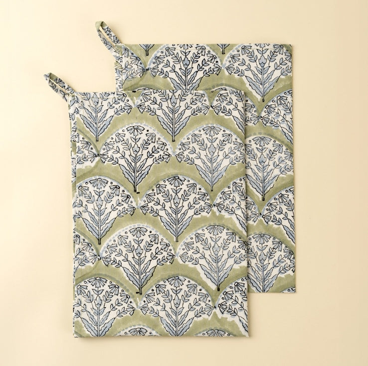 Sakura Block Print Tea Towels S/2, Green, Handcrafted Kitchen Textiles with Vintage-Inspired Charm