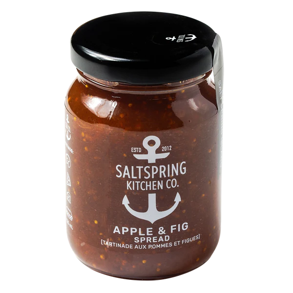 Apple & Fig Spread: Apples (apples, ascorbic acid, salt, citric acid), cane sugar, fig paste, Chardonnay (contains sulphites), oranges, fennel, and vanilla.