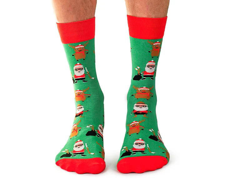 When you are leaving Santa his Christmas Eve snack, you can skip the milk and cookies. This Santa prefers eggnog, Nanaimo bars, and pecan butter tarts. Celebrate the holiday season in this festive pair of socks.