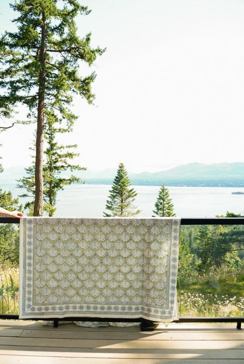 Sakura Block Print Tablecloth, Green, A Handcrafted Favourite for Effortless Table Styling