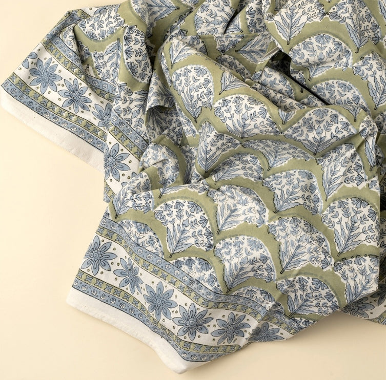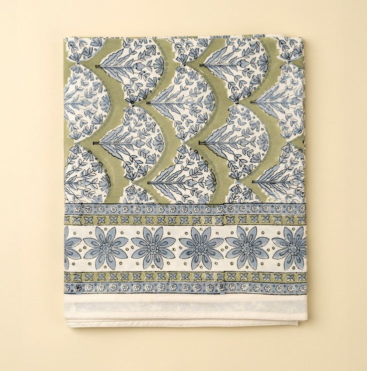 Dress your dining table with the artisanal charm of the Sakura Block Print Tablecloth, Green. Crafted in India from 100% cotton and printed by hand using traditional block printing methods, this sustainable kitchen textile features a soothing green base with elegant fan-shaped floral sprays in soft blue tones. A detailed border completes the look, adding definition to your tablescape and enhancing its decorative appeal. Perfect for everyday meals or festive gatherings, it offers an elevated yet easygoing way to incorporate handcrafted kitchen textiles into your home.