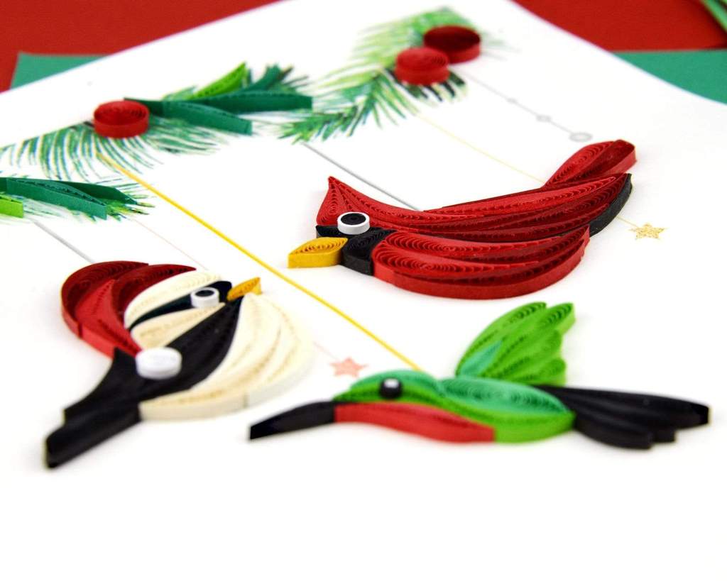The perfect holiday card for the bird lover in your life! The holiday bird ornament card has a quilled design of three colorful bird ornaments hanging on a Christmas tree branch.