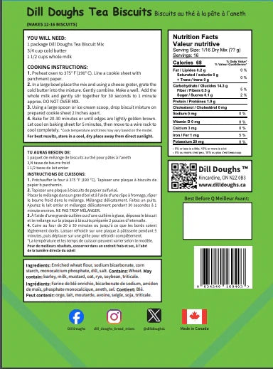 Indulge in the delightful flavours of Dill Doughs Tea Biscuit Mix! This easy-to-use mix requires just cold butter and milk to create soft, fluffy biscuits that are perfect for any occasion. Whether baked in the oven or on the BBQ, these dill-icious biscuits are a savory treat that pairs wonderfully with soups, stews, or as a snack on their own. Enjoy the comforting aroma and irresistible taste of homemade biscuits with minimal effort—perfect for gatherings or a cozy night in!