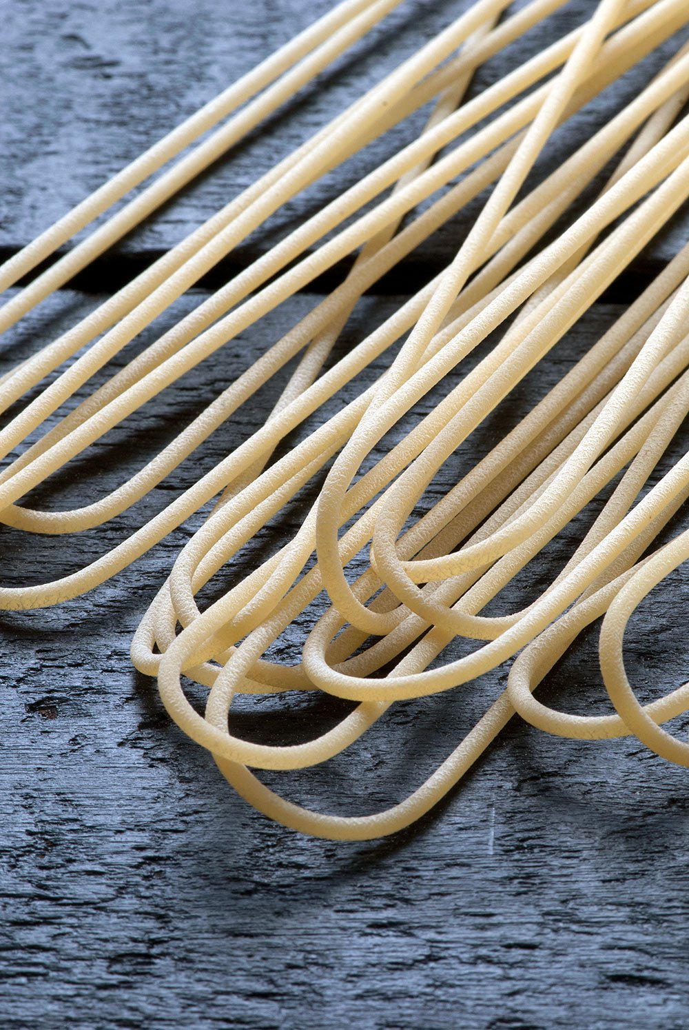 We use superior quality bronze dies to make our pasta. This imparts a lovely porous texture, which means sauces adhere more easily to the pasta shapes. The difference is obvious compared to industrial, Teflon-extruded pasta: the latter are shiny and smooth, offering no surface for the sauce to adhere. That is why the sauce ends up at the bottom of the plate instead.
