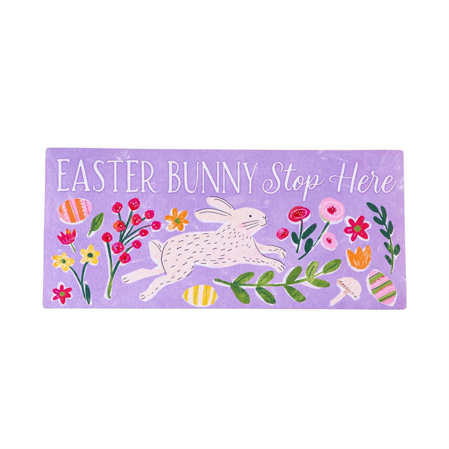 Give guests a warm welcome with this Sassafras Switch Mat. It features an adorable bunny surrounded by flowers. Crafted from heat-sublimated polyester with a rubber backing, this versatile mat is designed to fit perfectly within Evergreen's switch doormat bases. The mildew resistant mat is ideal for indoor or outdoor use and features a skid-resistant backing to help keep it in place. This welcoming mat will freshen up your stoop season after season while ensuring your home stays debris-free. For stains, simply spot clean with soap and warm water.