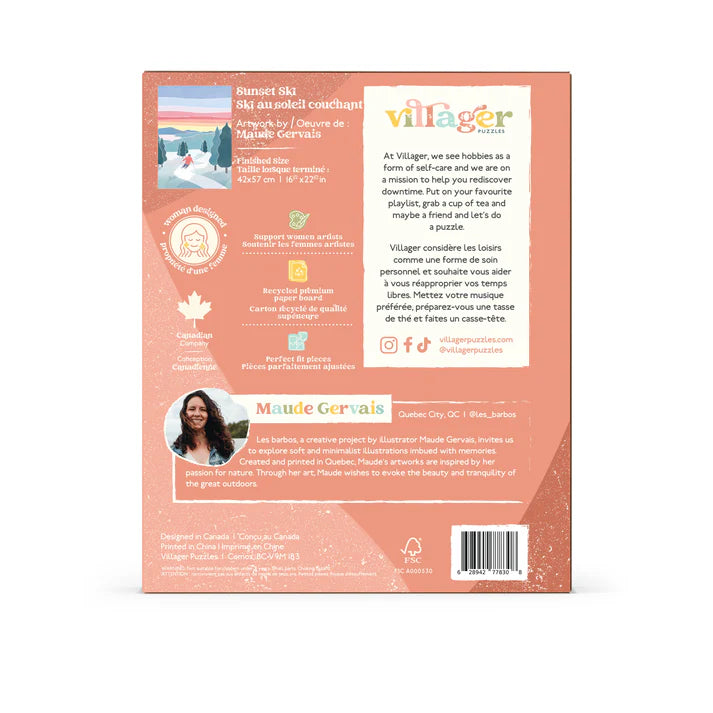 Time to hit the slopes - après style. Here's your ticket to the crisp mountain air and the beauty of a sunset ski run all from the comfort of your cozy & warm home. Grab a mug of hot chocolate and piece it all together. Beautifully-illustrated puzzle of a skier on the slopes at sunset, showcasing stunning gradient hues. Designed by talented Canadian artist and outdoor enthusiast, Maude Gervais.